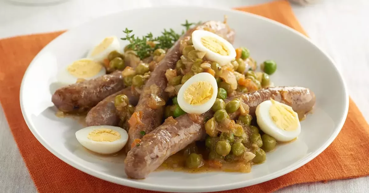 Salchichas con guisantes y huevos de codorniz