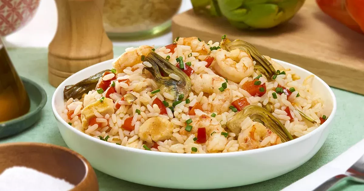 Arroz frito con pollo, gambas y alcachofa
